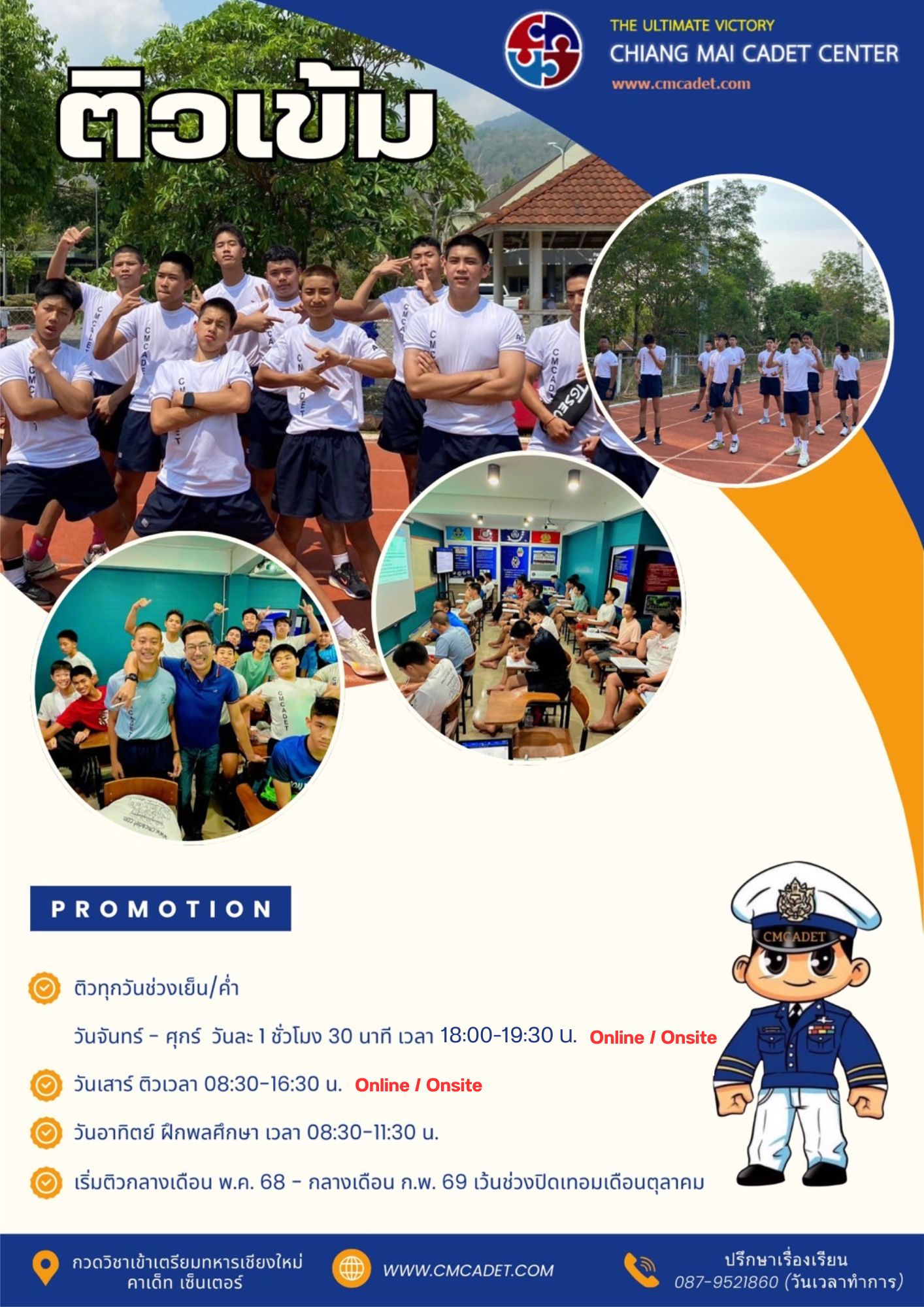 กวดวิชาเข้าเตรียมทหาร เชียงใหม่คาเด็ทเซ็นเตอร์ 61/3 ถนนอินทรวโรรส ตำบลศรีภูมิ อำเภอเมือง จังหวัดเชียงใหม่ โทรศัพท์ 081-7345734